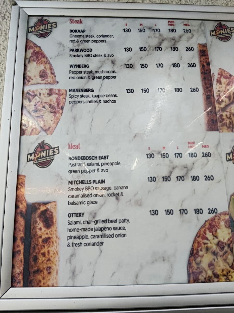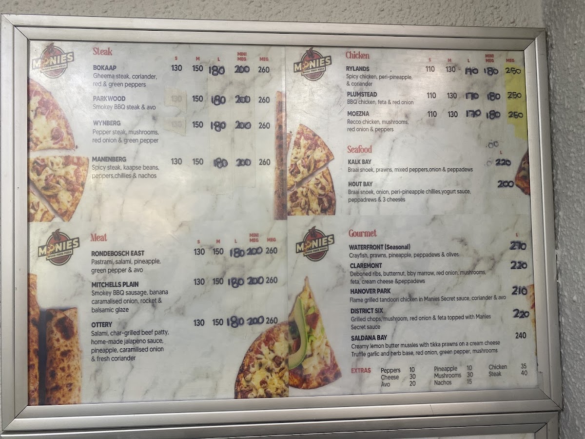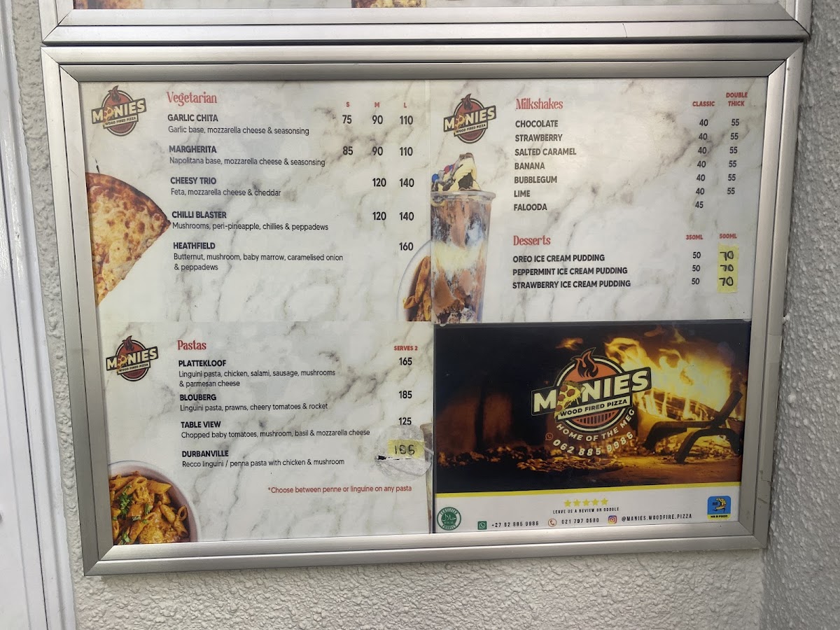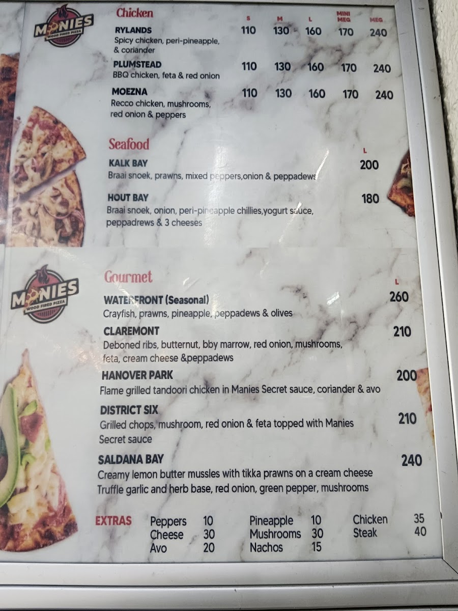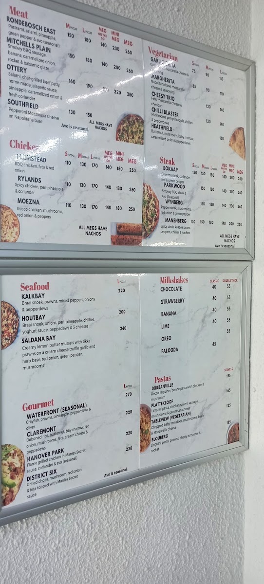 Highlights include unique options like the Bo Kaap Meg and Mani Chicken Pizza, alongside classics such as Plain Garlic Pizza and the Normal Pizza with salami, pineapple, and avocado. These choices fit well with the laid-back vibe of the spot, inviting you to savor familiar flavors with a touch of local character.